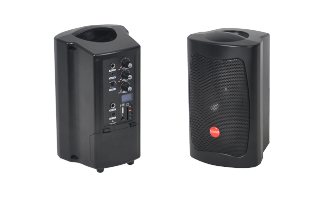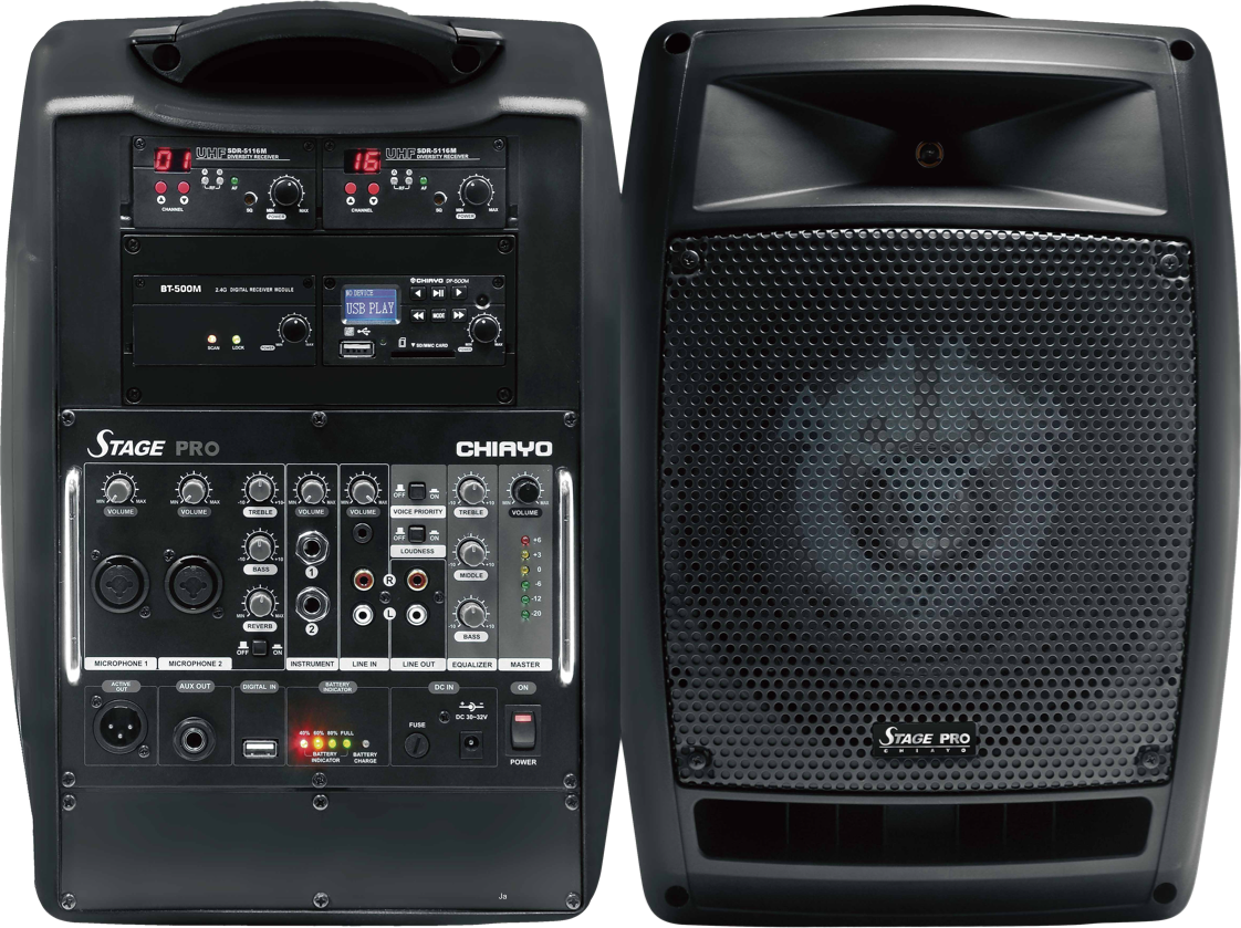 With its 200 watt class D amplifier this unit packs a punch! Powerful enough for a medium size gym or hall, the Stage Pro incorporates an 8’ woofer and 1” tweeter for clear crisp audio. Standard configuration: two wireless channels (with any style of mic), bluetooth receiver and a music player. Maximum number of wireless channels: four. Two separate wired mic and guitar/keyboard inputs along with an aux input are included. Other onboard features: switchable voice priority, three band equalizer and a digital limiter. Optional accessories: Charging cradle, trolley tote with telescopic handle and tripod.